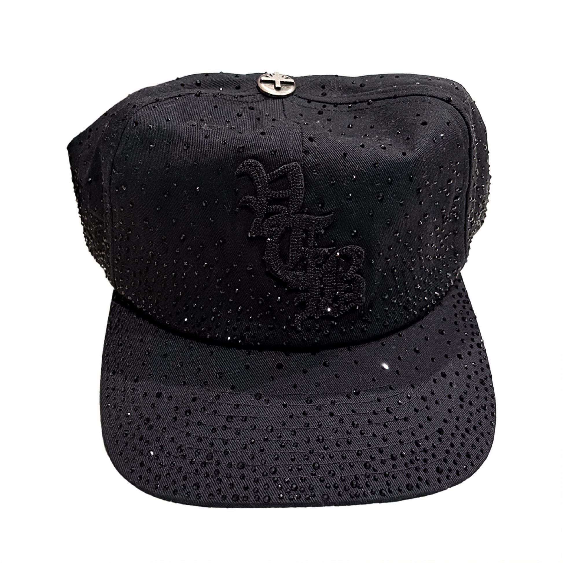 Made from premium fabric with a refined vintage finish, this snapback features hand placed rhinestone detailing across the crown and brim, giving the piece a subtle elevated shine. The distressed brim enhances its worn in character, while the 3D chain stitch embroidery adds bold dimensional texture at the front. An adjustable snapback closure provides a secure and comfortable fit for everyday wear. Inside, the Vertabrae interior liner highlights the attention to detail, and the metal cross button completes the piece with an industrial edge.
